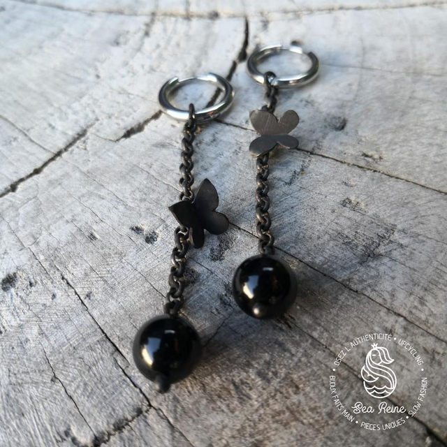 - Matériaux : Cymbale (upcyclée), et chaînes en laiton oxydée, anneaux en acier inoxydable 1,5 cm de diamètre et agates noires.