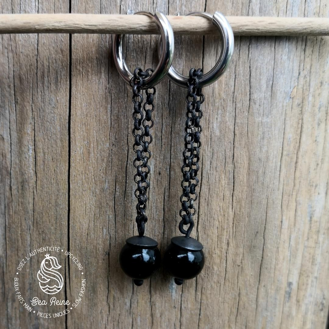 - Matériaux : Cymbale (upcyclée), et chaînes en laiton oxydée, anneaux en acier inoxydable 1,5 cm de diamètre et agates noires.